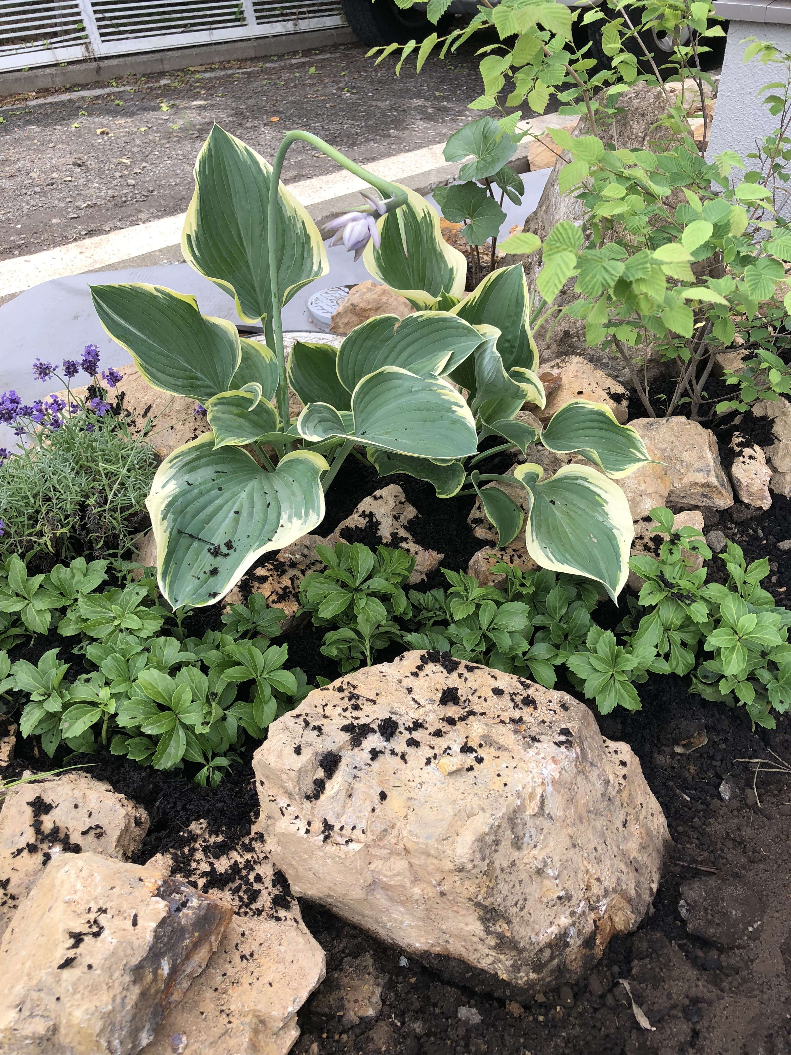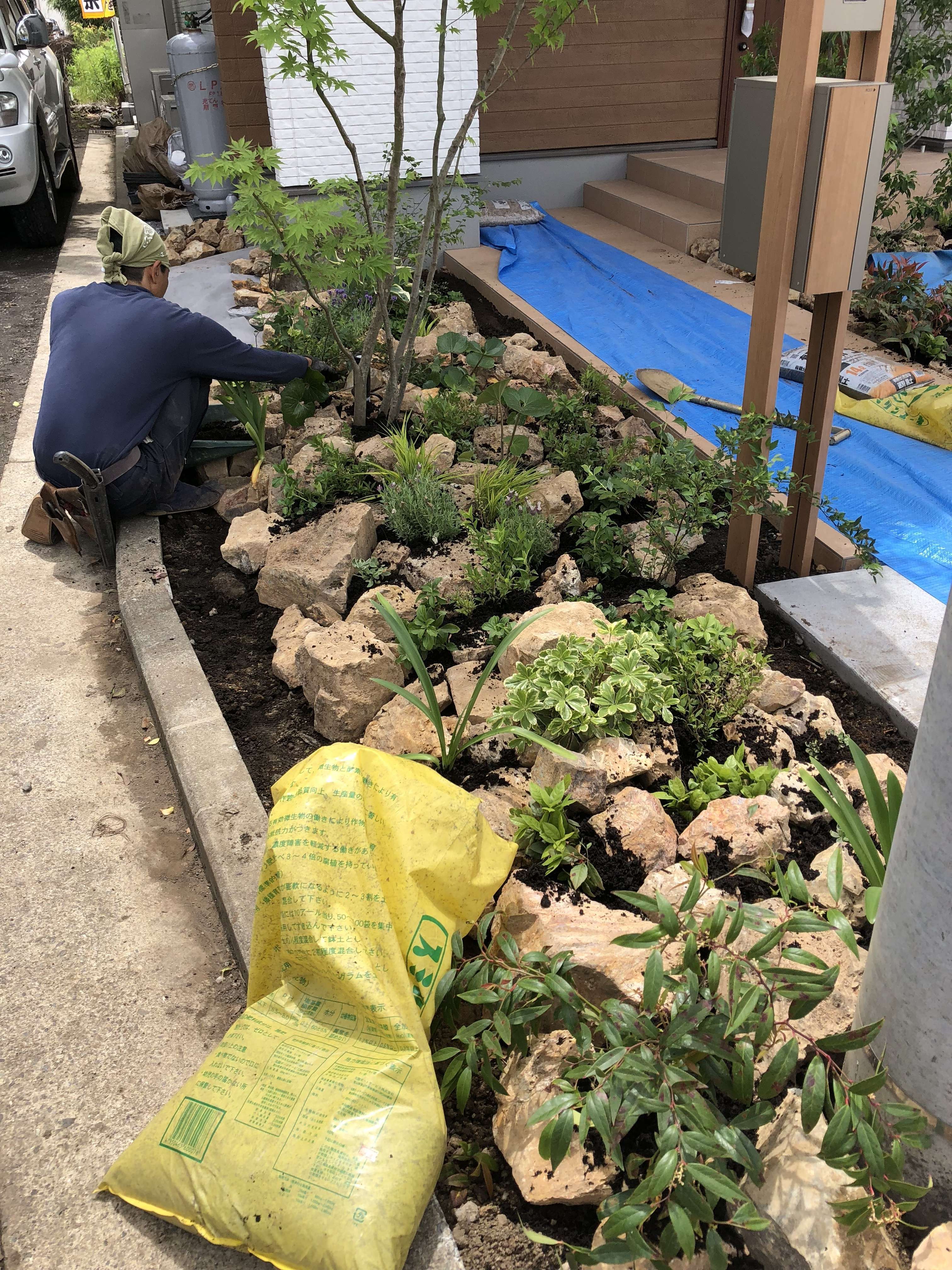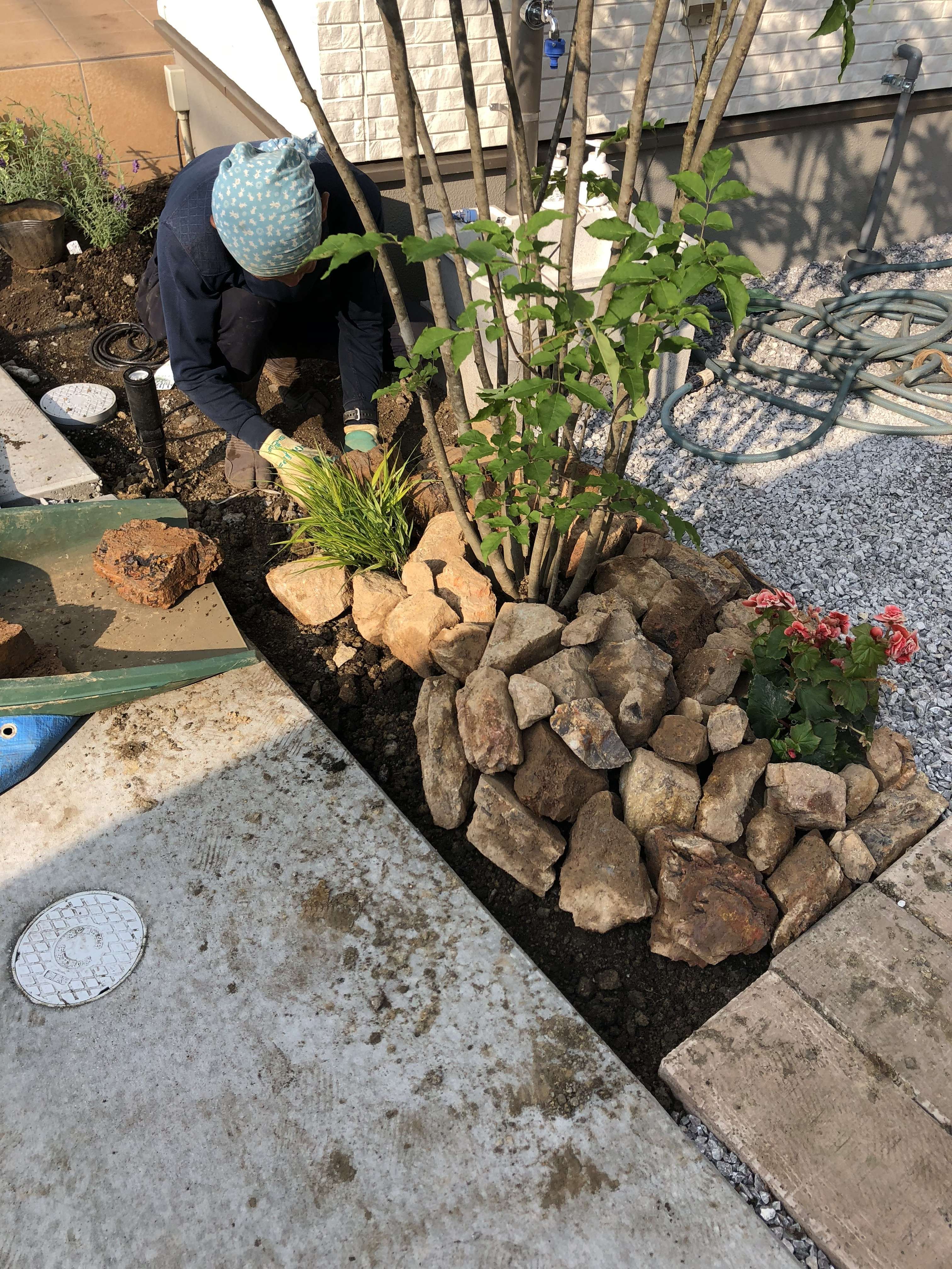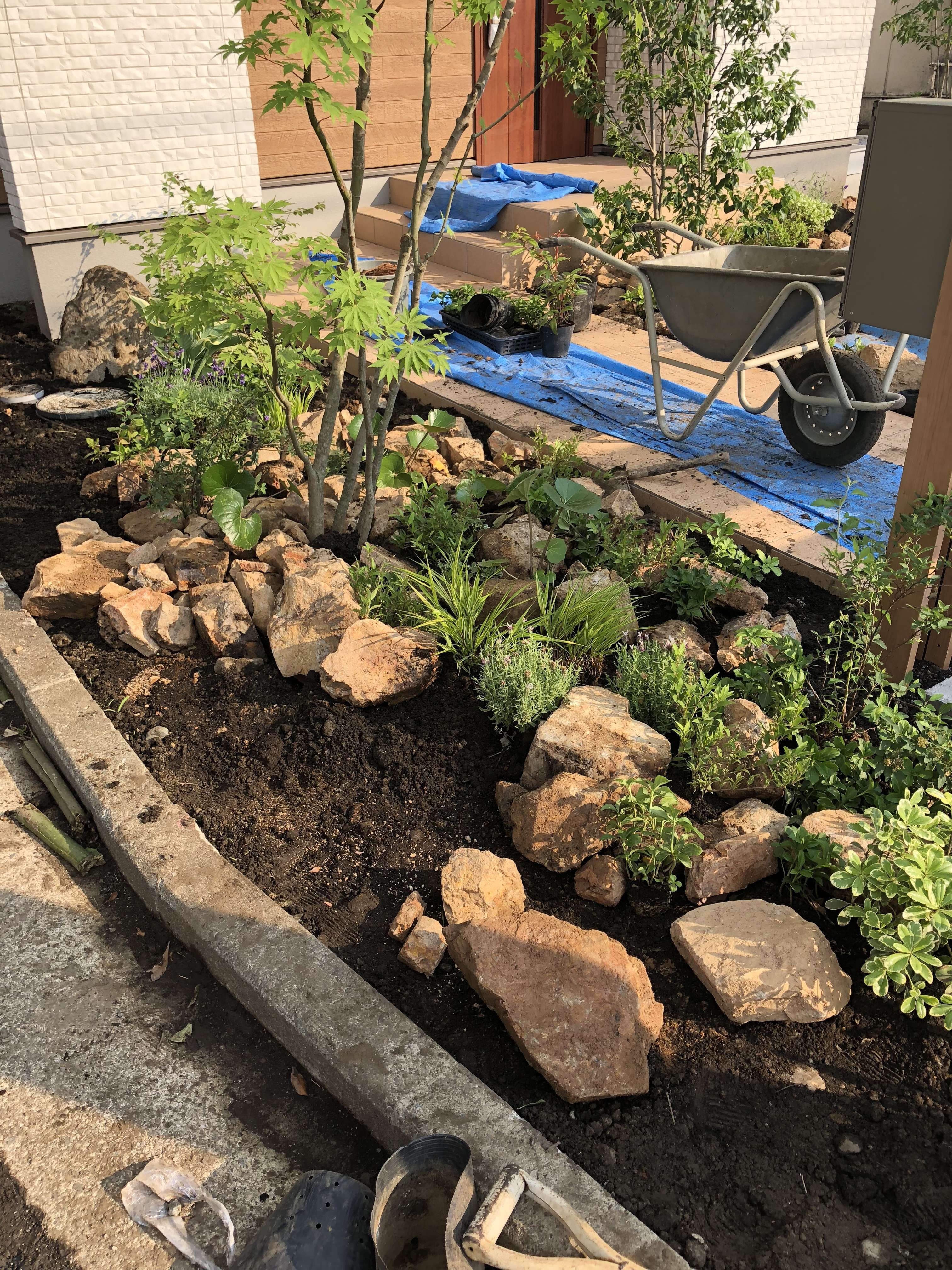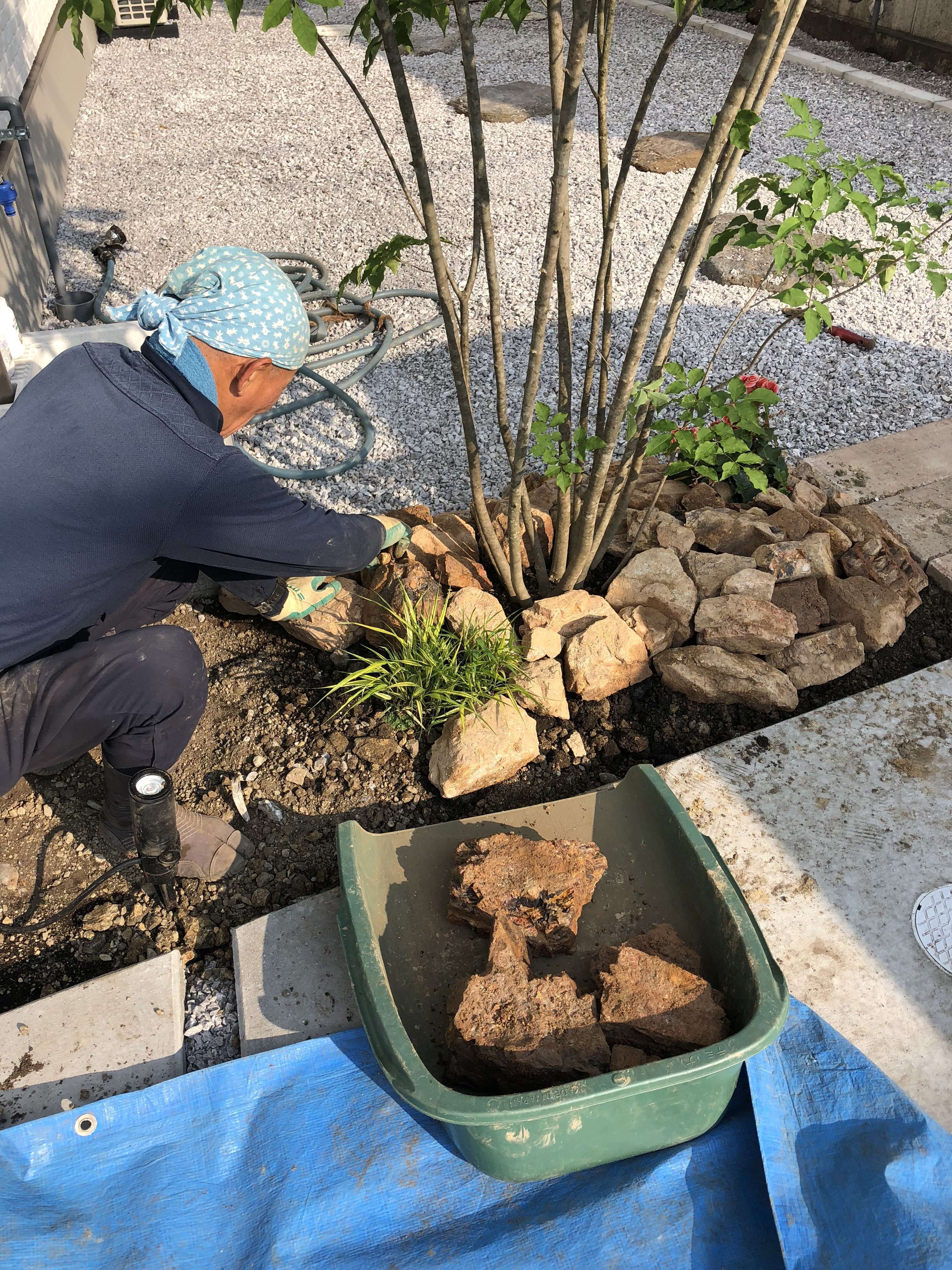 作庭の風景です。グリ石・草類・土・砂利を据えていきます。作り手の見せ所です。良くも悪くも、個人...