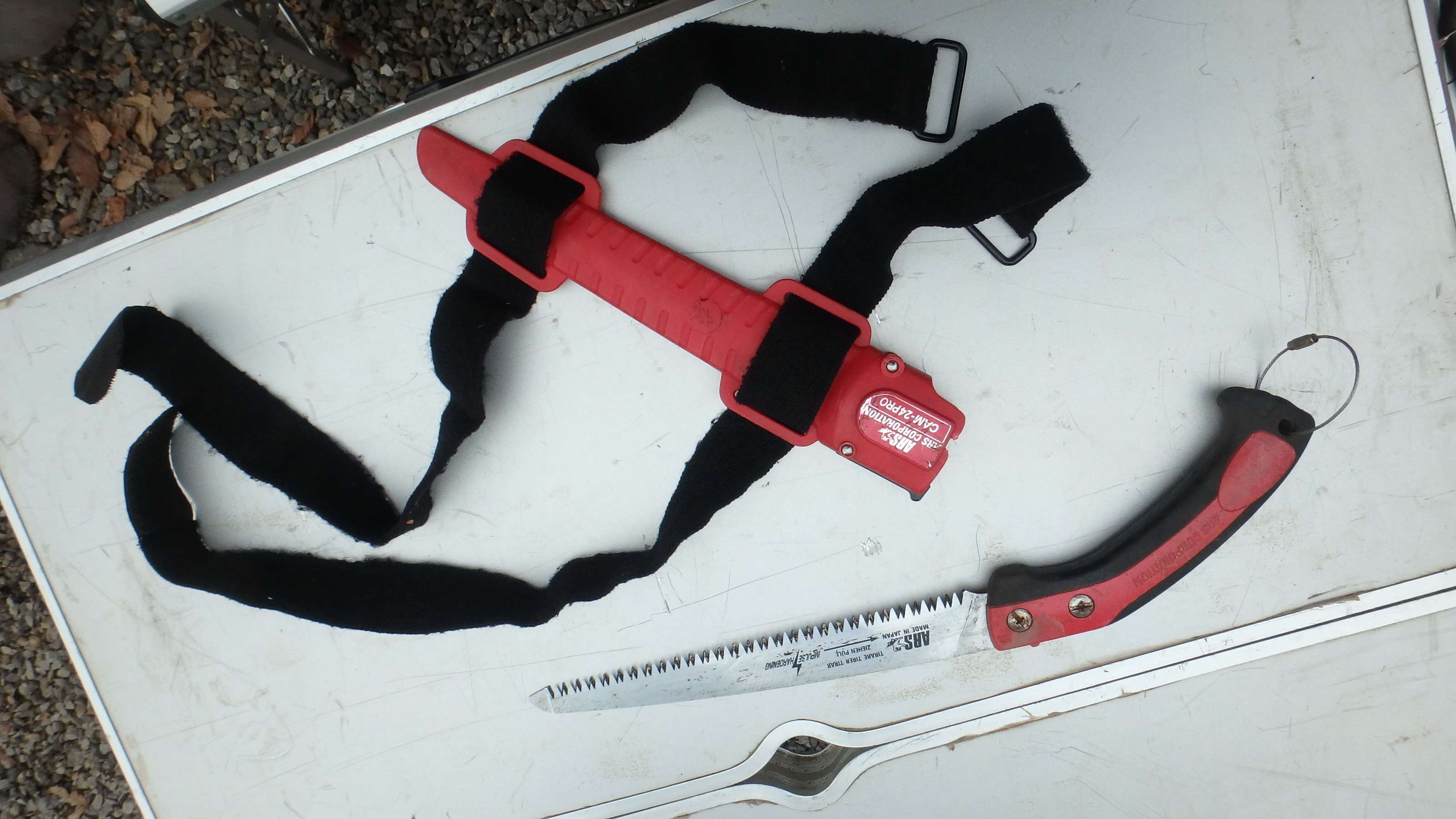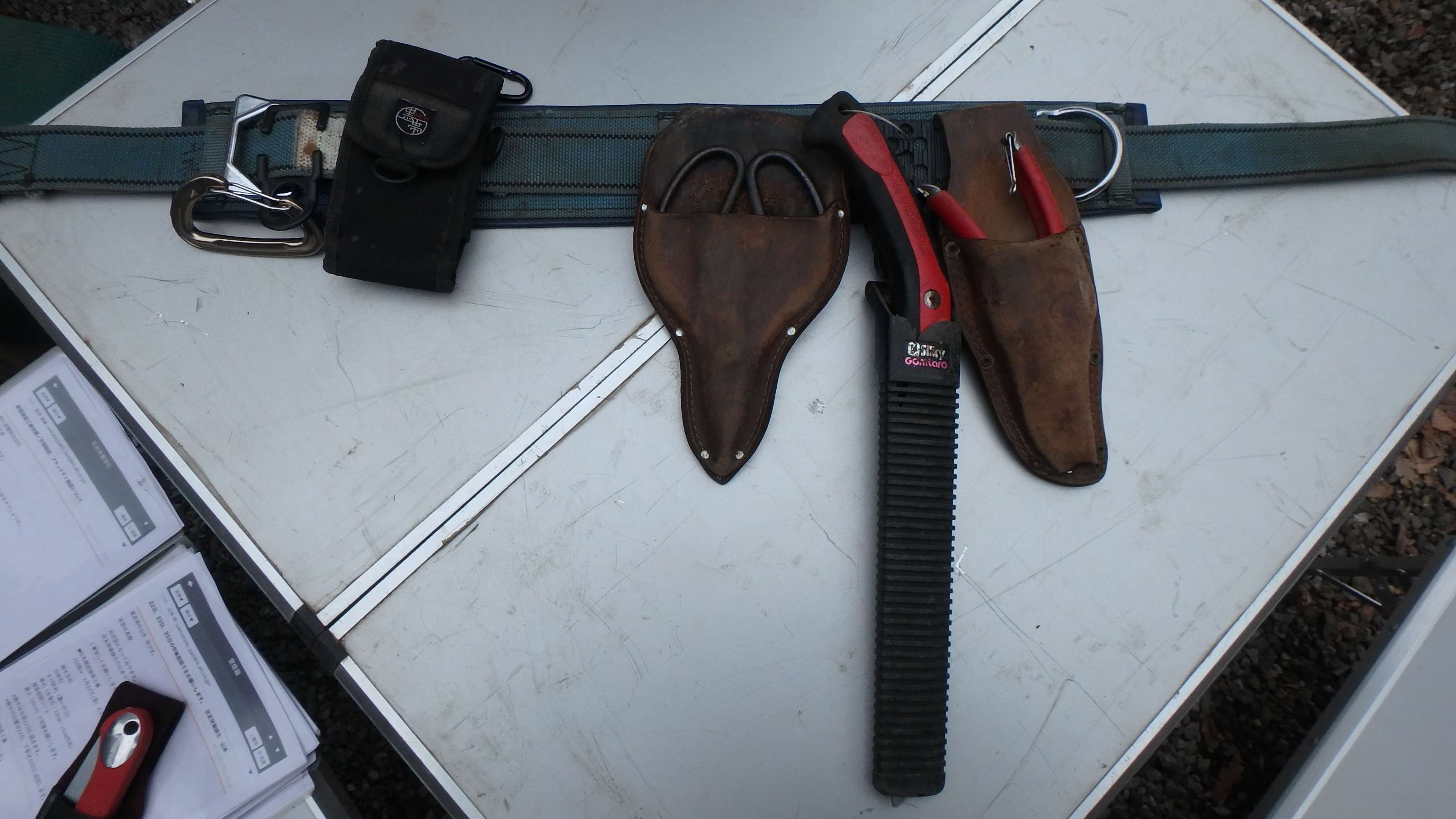 普段は腰道具としてベルトに着けてます。ちなみにこの写真はアルスのキャンパワーノコをシルキーのゴム太郎の鞘に入れて使ってます。